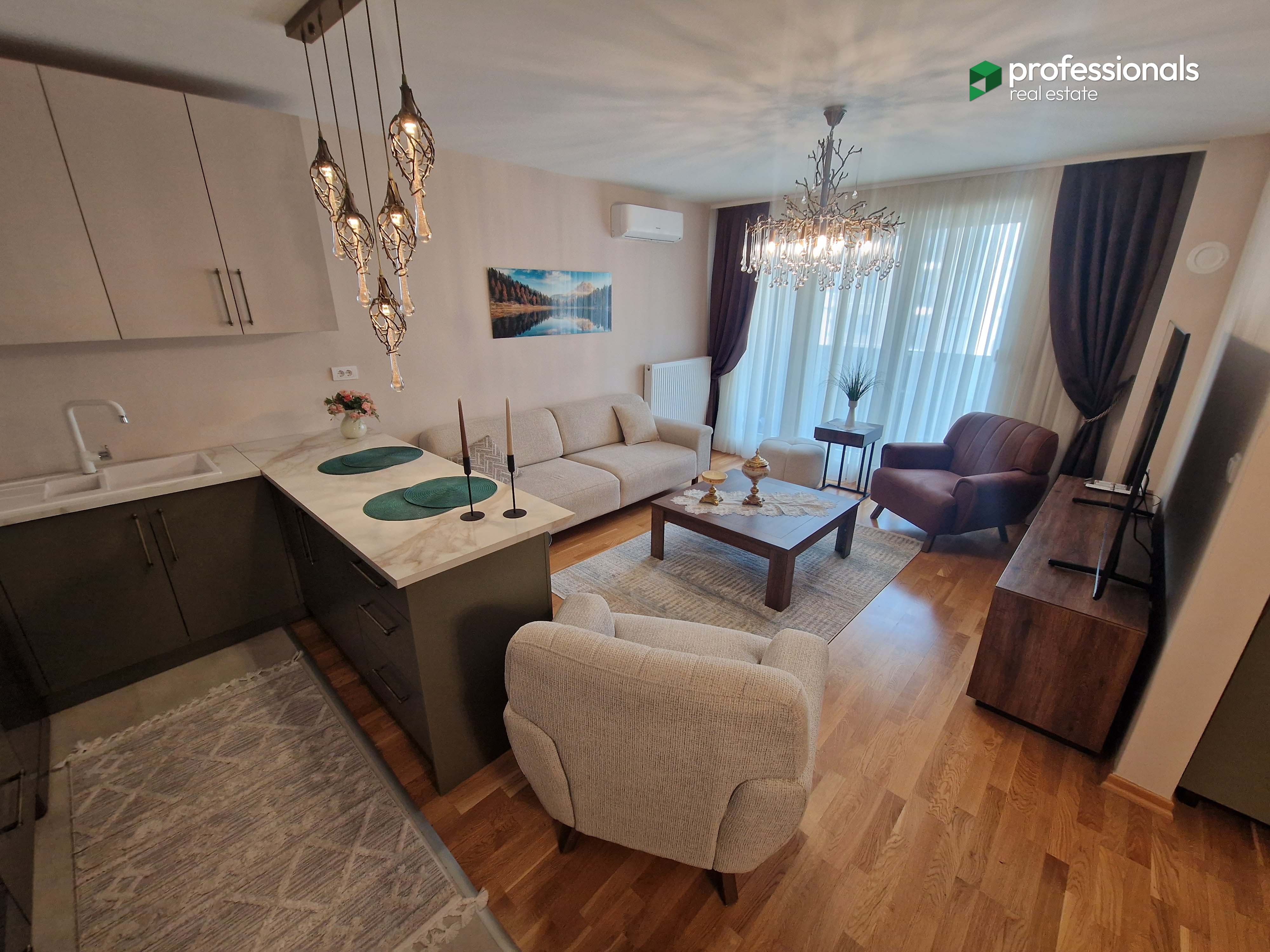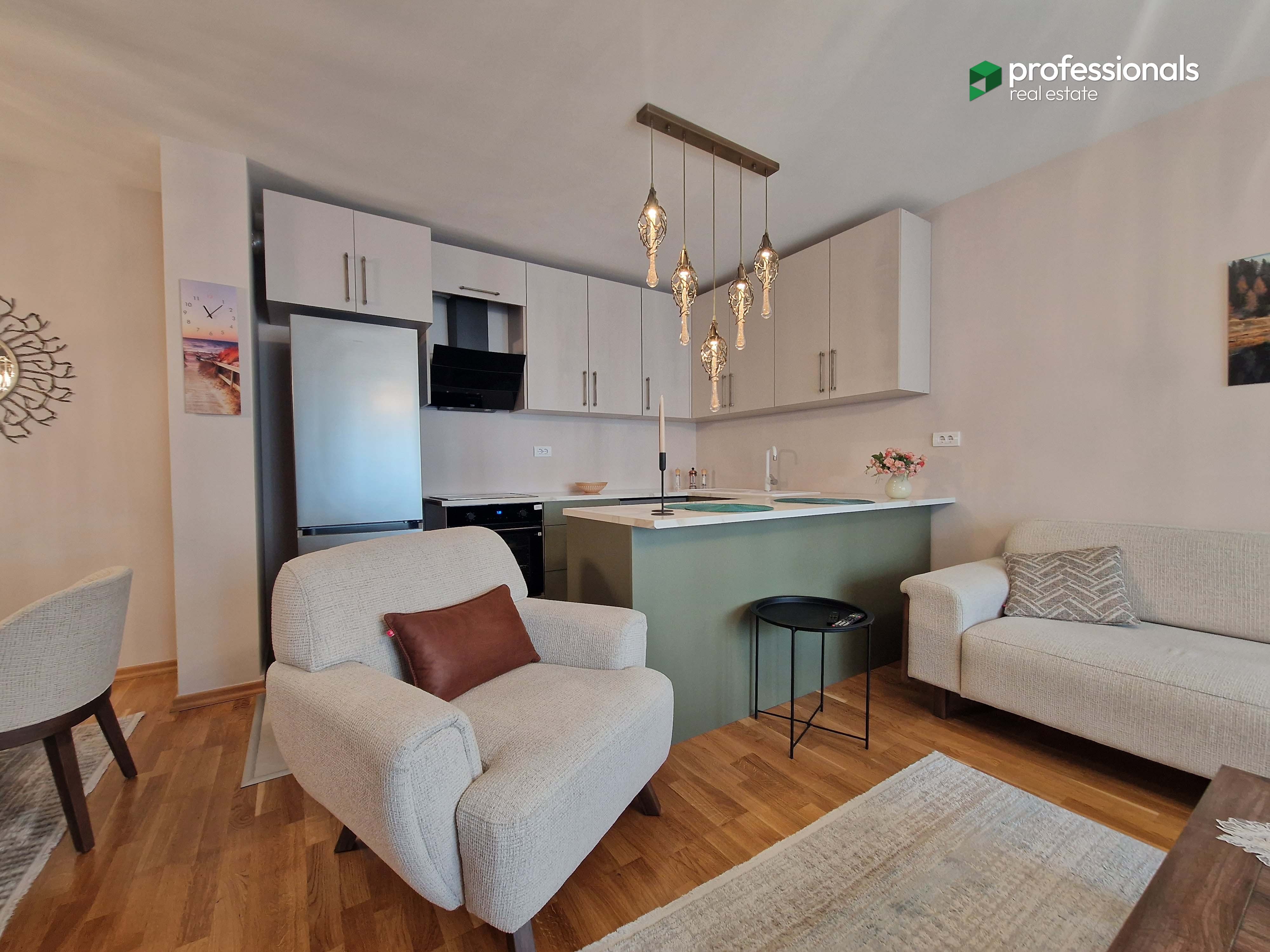 Stan se prodaje kompletno namješten sa svim potrebnim namještajem i elektro uređajima. Namještaj i uređaji su novi, jako kratko korišteni i u odličnom su stanju.